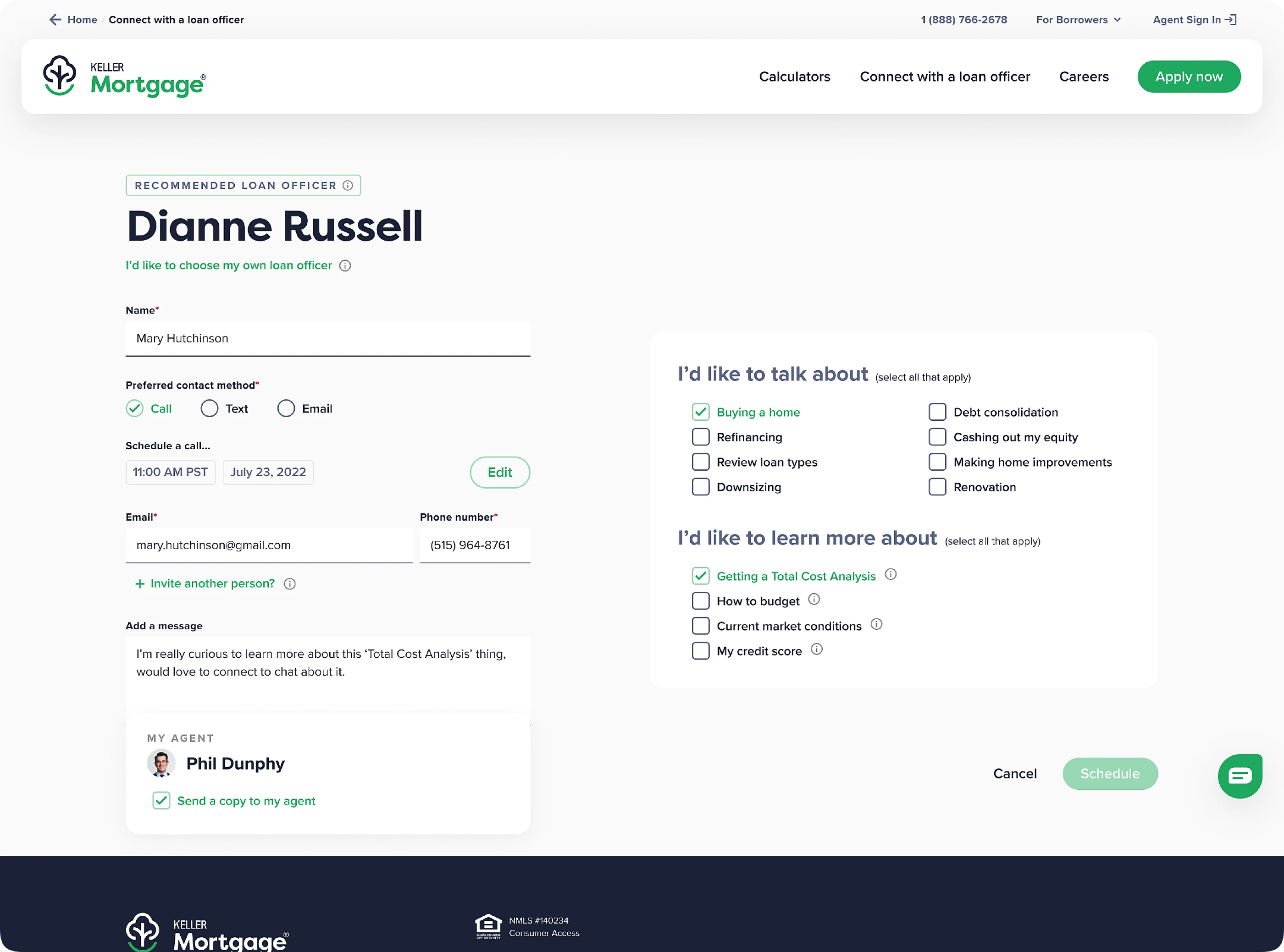Patterns such as this helped users not only select a Loan Officer to work with, but also seeded the concept of basing their homeownership journey in the context of wider financial planning. Through multiple rounds of testing over a year and half of development, this unique strategy was validated as remarkably effective in both winning customers in a crowded market, while reducing barriers to the dream of homeownership for thousands of customers.