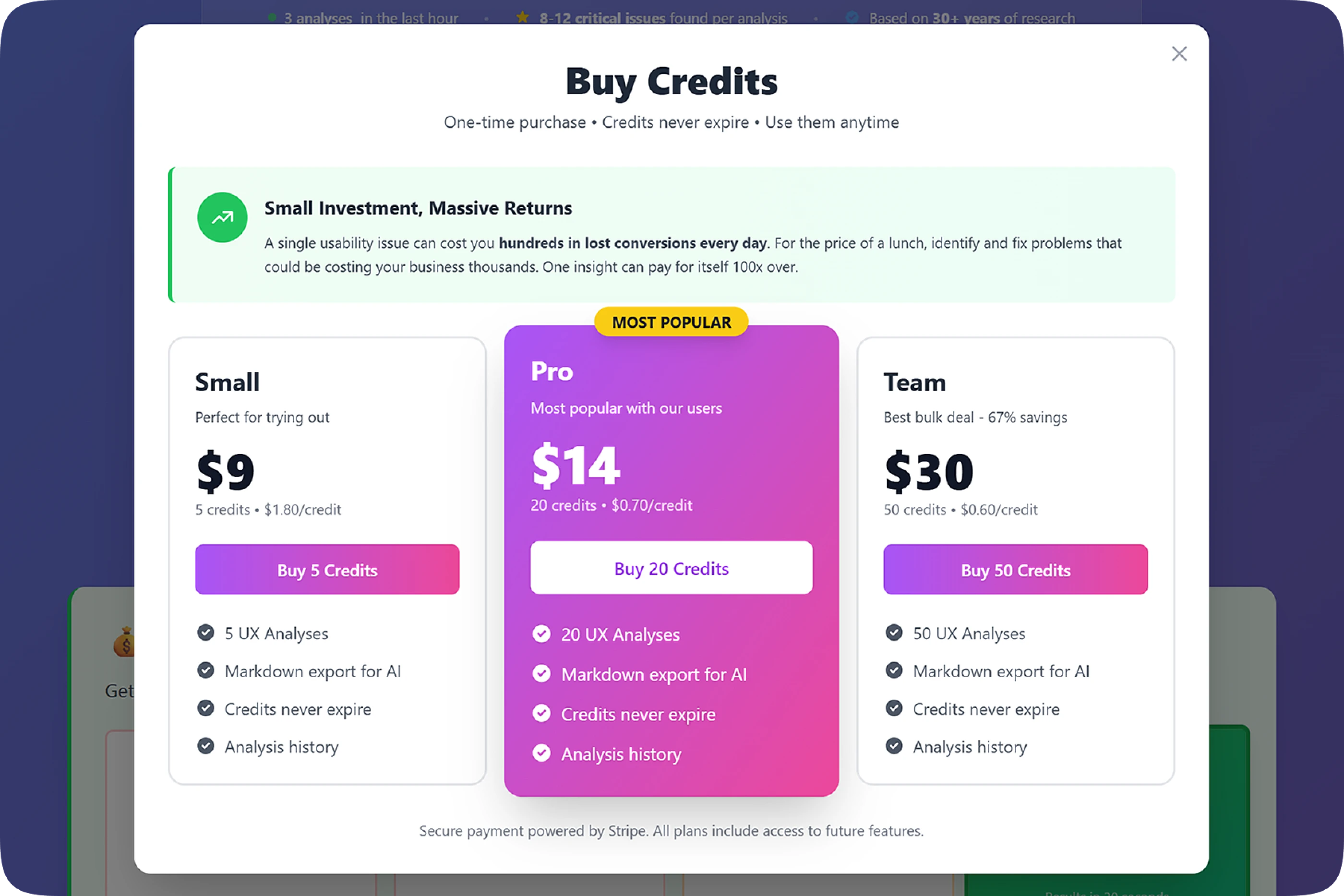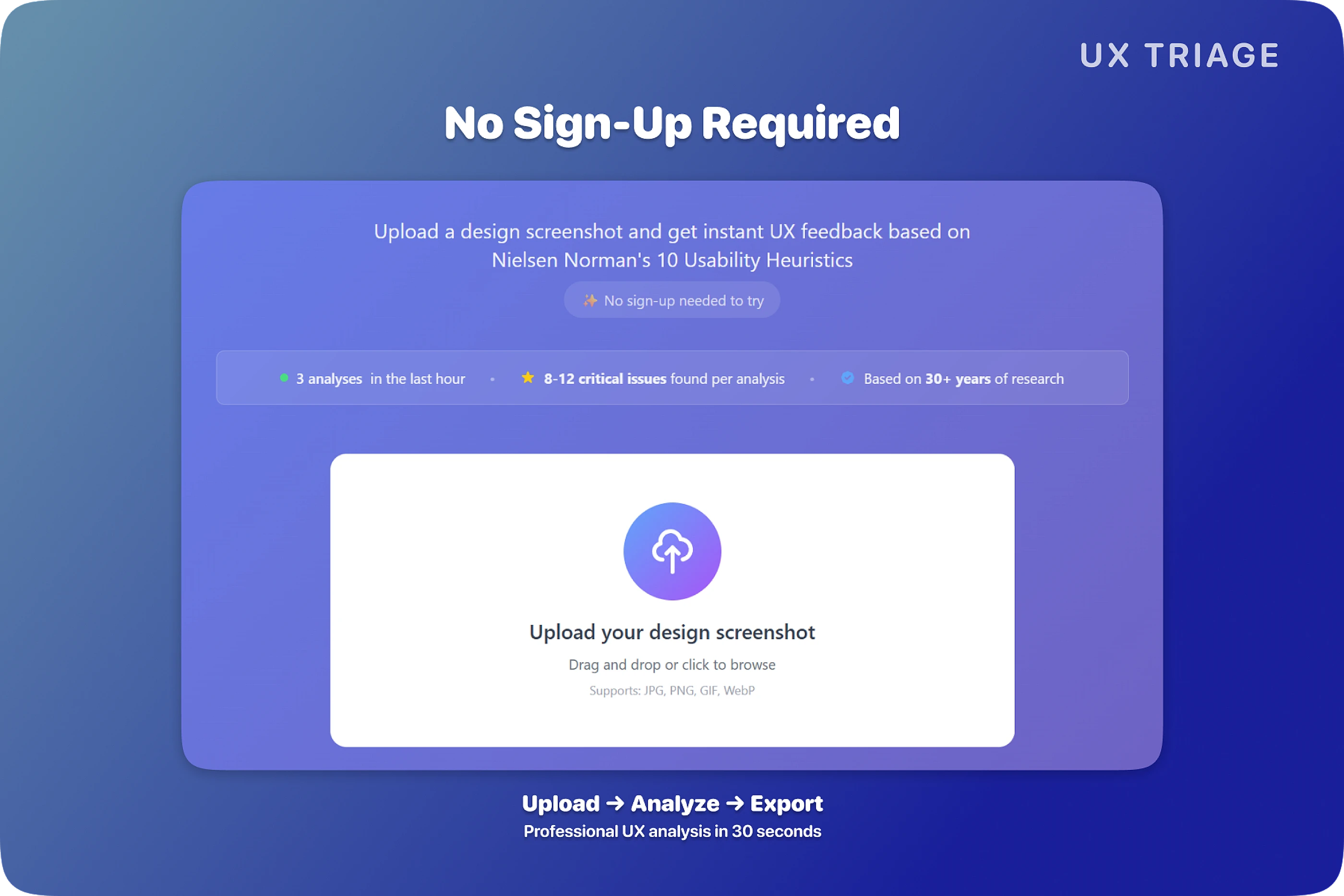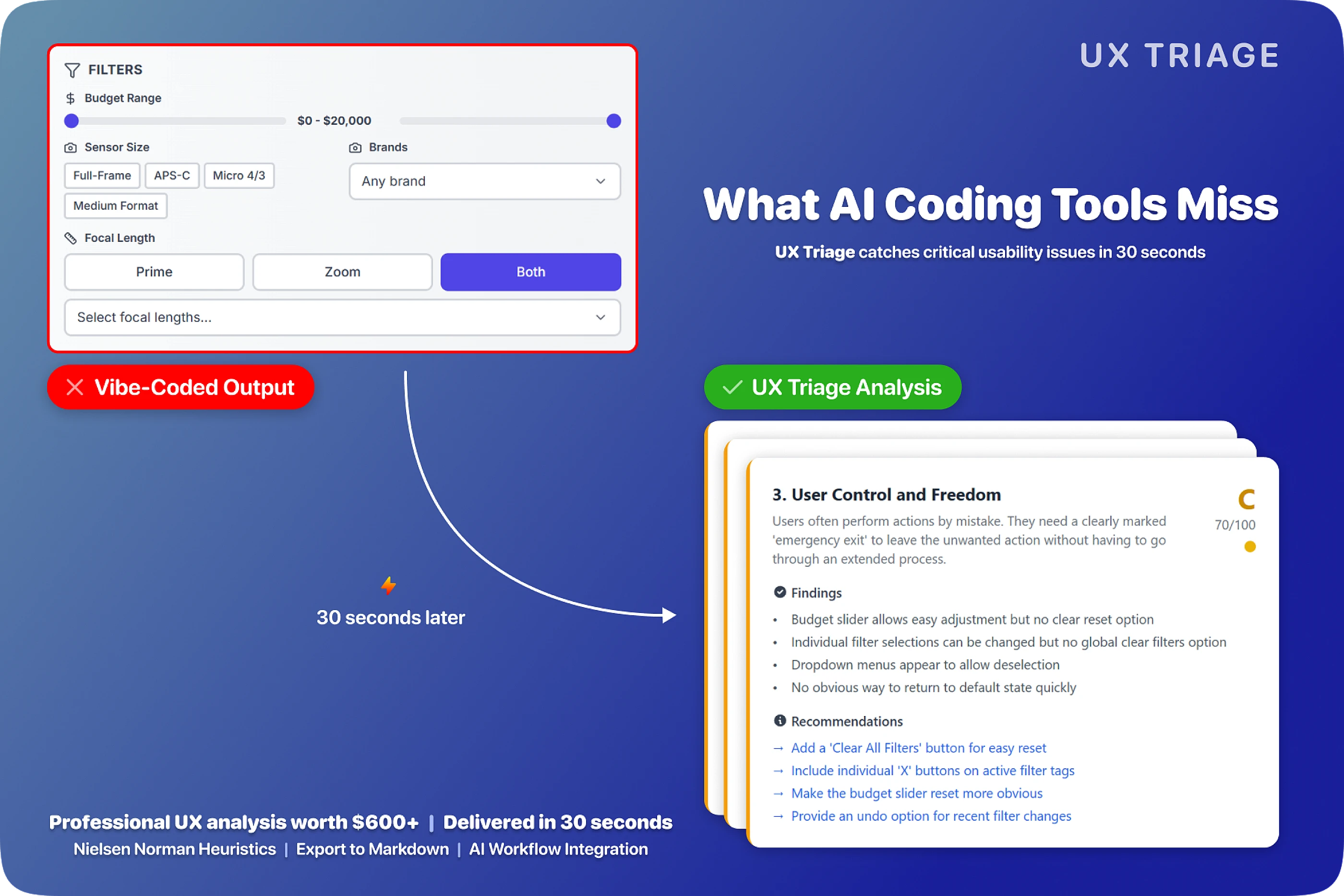 Vibe-coding creates UX debt. UX Triage catches what AI misses in 30 seconds. Upload screenshots, get Nielsen Norman heuristic analysis, export to Markdown, paste into your AI agent. From analysis to implementation instantly. 95% cheaper than consultants.