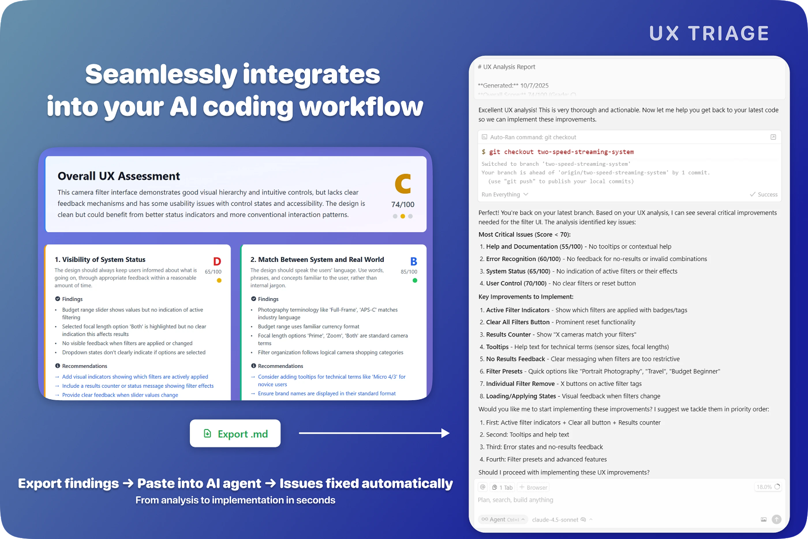 UX analysis → Markdown export → AI fixes issues. 30 seconds.