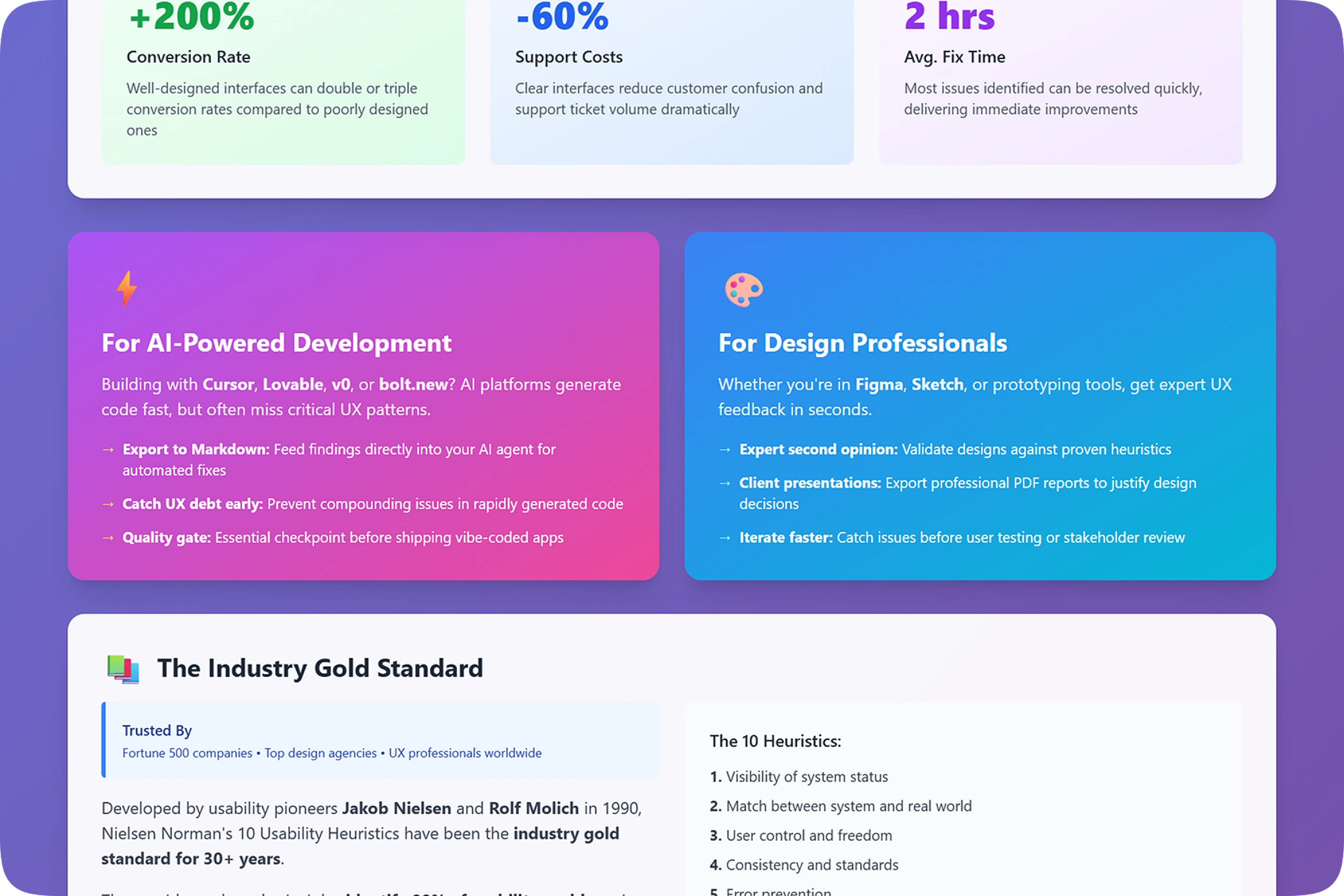 Every analysis finds 8-12 real issues I might have shipped otherwise. It's based on Nielsen Norman's proven heuristics, analyzes designs in 30 seconds, and exports findings as Markdown so you can feed them right back into your AI agent.